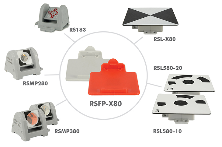 The prisms RSMP180, RSMP280, RSMP380 and the reflector marks RS183 can be clicked on and off the mounting plate easily.